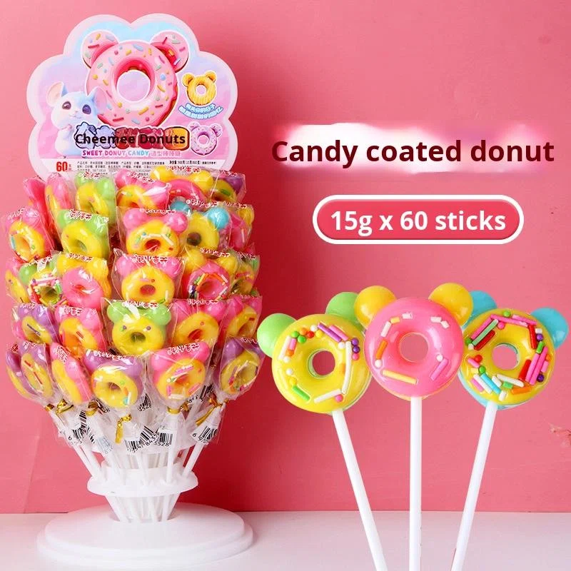 These donut-inspired lollipops combine fruit flavors with playful round shapes. Their colorful sugar coatings and soft-hard balance make them appealing to children and suitable for small shops or novelty assortments.